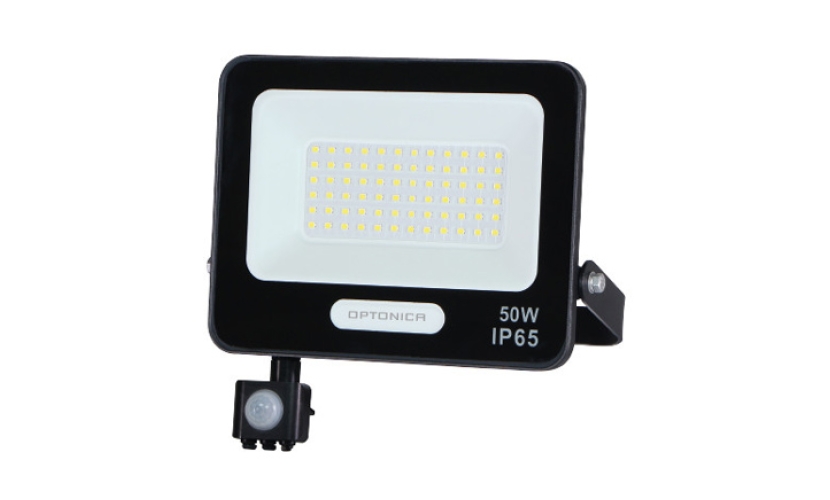 LED προβολέας της Optonica, με ισχύ 50W και αισθητήρα κίνησης PIR με οπτικό πεδίο ανίχνευσης 120°. Διαθέτει μεταλλικό περίβλημα με στεγανοποίηση επιπέδου IP65 και είναι κατάλληλος για χρήση σε εξωτερικούς χώρους.