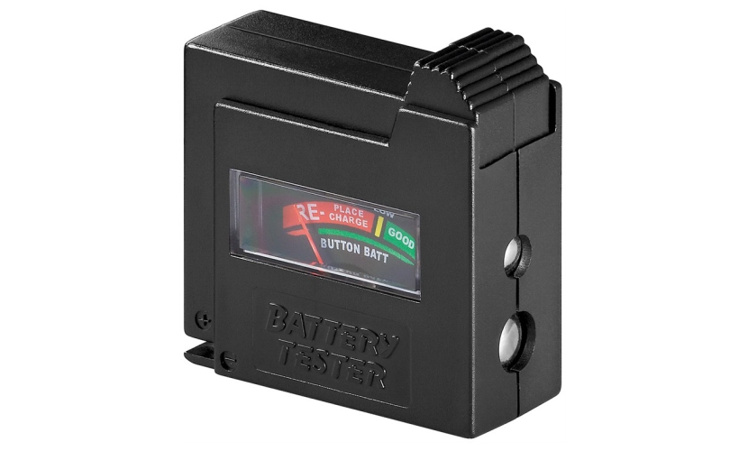 Battery tester της Goobay με ένδειξη της κατάστασης της μπαταρίας. Είναι συμβατό με μπαταρίες AAA (Micro), AA (Mignon), C (Baby), D (Mono), 9V Block, N (Lady).