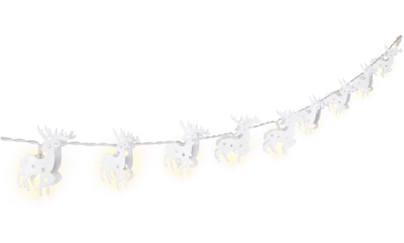 Λαμπάκια LED με διακοσμητικούς μεταλλικούς τάρανδους σε λευκό χρώμα που συνδέονται με ένα διαφανές καλώδιο συνολικού μήκους 1.3 μέτρα. Είναι ιδανικά για την χριστουγεννιάτικη διακόσμηση σε οποιονδήποτε εσωτερικό χώρο.Η θερμοκρασία χρώματος είναι 3000K (θερμό λευκό) ενώ διαθέτουν λειτουργία χρονοδιακόπτη και βαθμό προστασίας IP20.Λειτουργούν με 2x AA μπαταρίες οι οποίες δεν συμπεριλαμβάνονται στην συσκευασία.