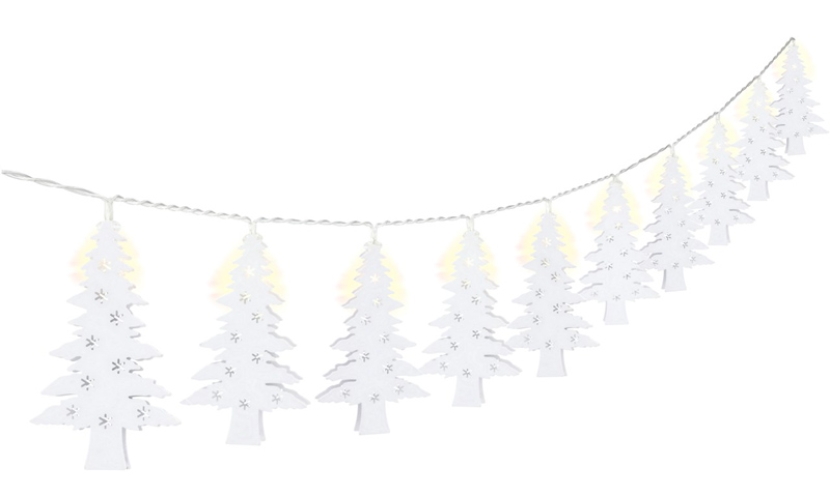 Λαμπάκια LED με διακοσμητικά μεταλλικά δεντράκια σε λευκό χρώμα που συνδέονται με ένα διαφανές καλώδιο συνολικού μήκους 1.3 μέτρα. Είναι ιδανικά για την χριστουγεννιάτικη διακόσμηση σε οποιονδήποτε εσωτερικό χώρο.Η θερμοκρασία χρώματος είναι 3000K (θερμό λευκό) ενώ διαθέτουν λειτουργία χρονοδιακόπτη και βαθμό προστασίας IP20.Λειτουργούν με 2x AA μπαταρίες οι οποίες δεν συμπεριλαμβάνονται στην συσκευασία.