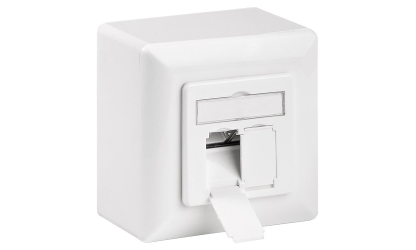 Επιτοίχια πρίζα με 2 θύρες δικτύου για σύνδεση καλωδίων με βύσμα RJ45. Είναι θωρακισμένη, ικανή για ταχύτητες 10 GBit Ethernet και ιδανική για χρήση PoE+ IEEE 802.3at.