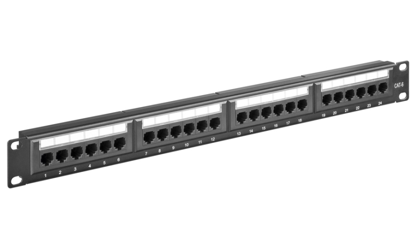 Patch panel της Goobay για τοποθέτηση σε καμπίνα δικτύου 19". Μπορούν να εγκατασταθούν έως και 24 καλώδια δικτύου.