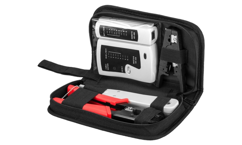 -σετ κατάλληλο για εγκατάσταση & δοκιμή του οικιακού δικτύου-tester δικτύου για RJ11, RJ12 & RJ45-πρέσα ακροδεκτών για βύσματα 8P/6P-απογυμνωτής για κοπή καλωδίων με διατομή αγωγού έως AWG22-καρφωτικό εργαλείο συρμάτωσης τύπου KRONE-με τσαντάκι οργάνωσης & μεταφοράς των εργαλείων
