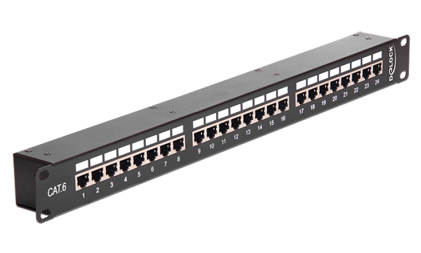 Patch panel της Delock που μπορεί να τοποθετηθεί σε 19" rack. Οι υποδοχές στο μπροστινό και πίσω μέρος του panel παρέχουν βολικές συνδέσεις για 24x RJ45 καλώδια στο μπροστινό μέρος και 24x RJ45 καλώδια στο πίσω μέρος.