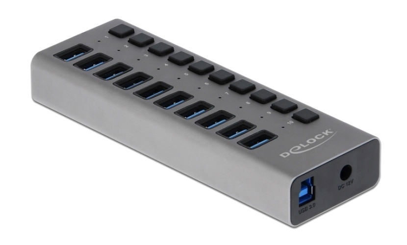 Το Hub USB 3.0 της Delock μπορεί να συνδεθεί με υπολογιστή μέσω καλωδίου USB επεκτείνοντας τον με 10 θύρες USB. Οι συνδεδεμένες συσκευές όπως τα smartphone μπορούν να φορτιστούν ή να μεταφέρουν δεδομένα στα 5 Gbps. Κάθε θύρα μπορεί να ενεργοποιηθεί ή να απενεργοποιηθεί ξεχωριστά χρησιμοποιώντας τους διακόπτες. Είναι ένα κομψό προϊόν υψηλής ποιότητας το οποίο είναι κατασκευασμένο από αλουμίνιο. Το design και η αίσθηση του μεταλλικού υλικού της κατασκευής δίνει ιδιαίτερο τόνο στο γραφείο σας, ταιριάζοντας αρμονικά με τις υπόλοιπες συσκευές σας.