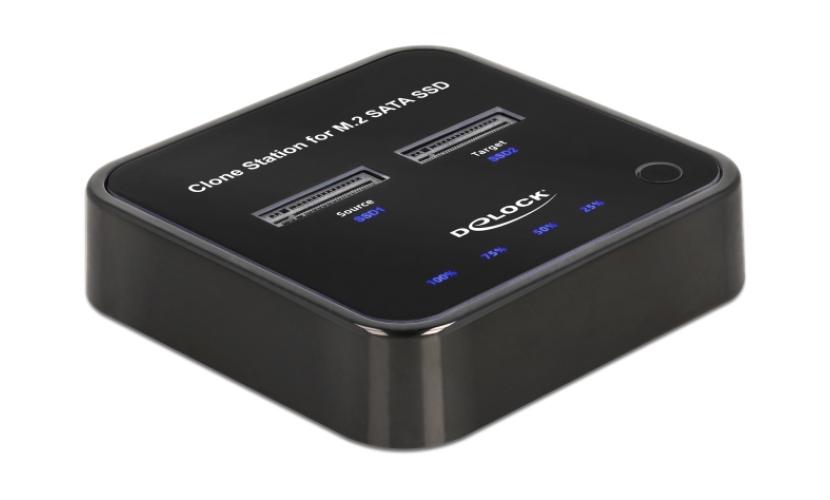 Αυτό το docking station της Delock επιτρέπει την σύνδεση έως δύο M.2 SATA SSD σε έναν υπολογιστή μέσω θύρας USB-C (συμπεριλαμβάνεται καλώδιο).Υποστηρίζει λειτουργία κλωνοποίησης που επιτρέπει την αντιγραφή περιεχομένου από ένα SSD σε άλλο χωρίς τη χρήση υπολογιστή.