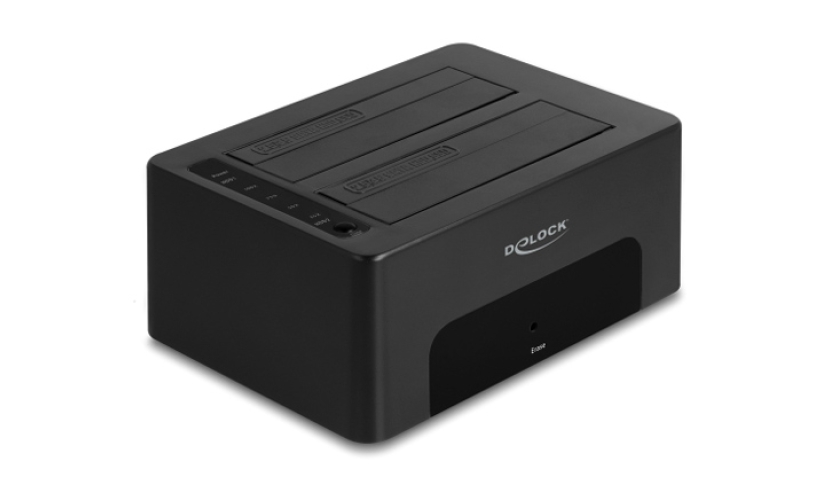Αυτό το docking station της Delock επιτρέπει την σύνδεση έως δύο 2.5" ή 3.5" SATA HDD ή SSD σε έναν υπολογιστή μέσω θύρας USB.Υποστηρίζει λειτουργία κλωνοποίησης που επιτρέπει την αντιγραφή περιεχομένου από ένα HDD σε άλλο χωρίς τη χρήση υπολογιστή. Επιπλέον, με την λειτουργία διαγραφής, μπορείτε να διαγράψετε το περιεχόμενο των σκληρών δίσκων χωρίς να χρειαστεί να τους συνδέσετε στον υπολογιστή.