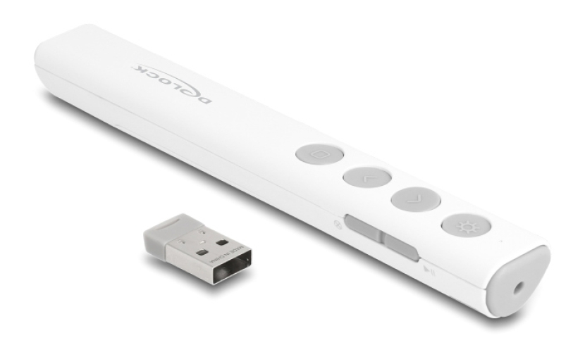 Τεχνικά χαρακτηριστικά-Σύνδεση: Nano USB receiver-Πηγή laser: Κλάση laser 2 630 - 680nm, <1 mW-Εύρος ζώνης: 2.4 GHz, εύρος λειτουργίας έως 30m-Εύρος συχνότητας: 2405/2450/2475MHz-Ισχύς μετάδοσης: Max 1mW-Τροφοδοσία: 1x AAA μπαταρία (δεν συμπεριλαμβάνεται)-Διαστάσεις (ΜxΠxΥ): ~141 x 20 x 16mm-Υλικό: Πλαστικό-Χρώμα: Λευκό
