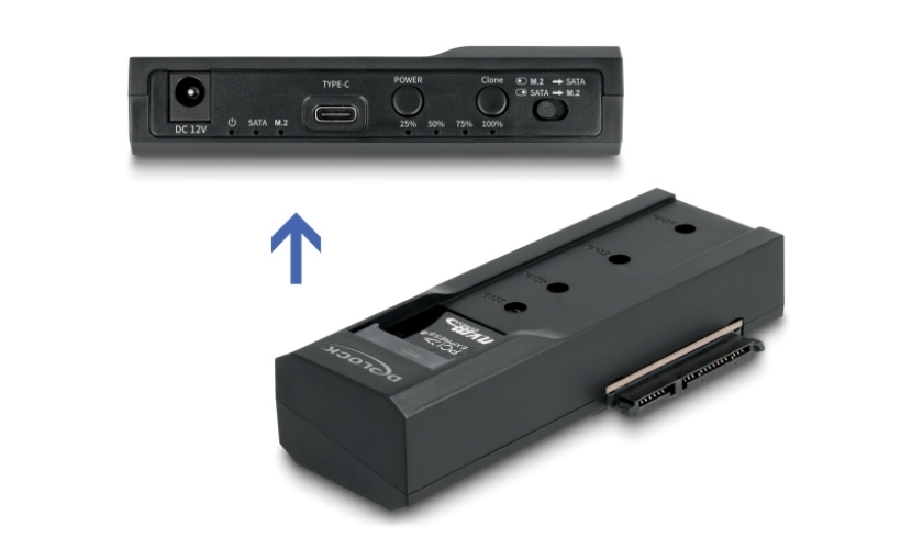 Αυτό το docking station της Delock επιτρέπει την σύνδεση ενός M.2 NVMe/SATA SSD (σε 2280, 2260, 2242 and 2230 format) ή ενός 2.5"/3.5" SSD/HDD σε ένα PC ή laptop μέσω θύρας USB ή USB-C (συμπεριλαμβάνονται καλώδια).Υποστηρίζει λειτουργία κλωνοποίησης που επιτρέπει την αντιγραφή περιεχομένου από ένα HDD/SSD σε άλλο χωρίς τη χρήση υπολογιστή.