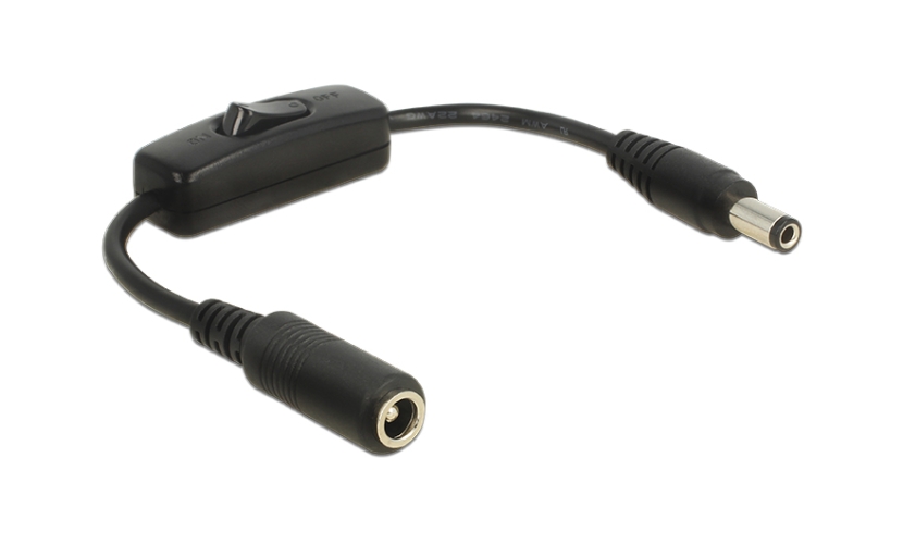This cable by Delock can be connected to a DC power port. By using the on / off switch the power supply for the connected device can be switched on or off. Therefor it is not needed to remove the cable from the female port to switch off the power supply.