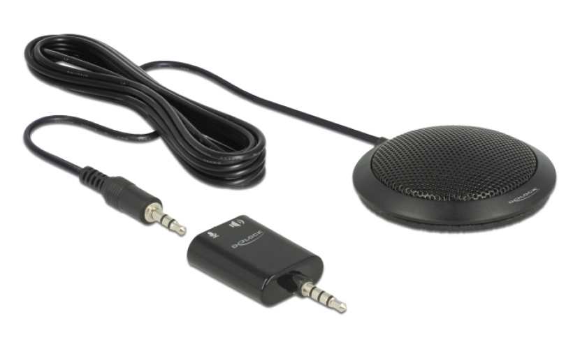 Επιτραπέζιο πυκνωτικό μικρόφωνο της Delock. Η υπερκατευθυντική και κωνική κατεύθυνσή του βεβαιώνει πως ο ήχος δεσμεύεται άριστα και γι’ αυτό διαθέτει μεγάλο εύρος και είναι κατάλληλο για καταγραφή συνεντεύξεων, συνεδρίων, διαλέξεων κτλ. Μπορεί να συνδεθεί σε οποιοδήποτε PC ή laptop μέσω της θύρας στερεοφωνικής υποδοχής των 3.5mm 3pin. Ο αντάπτορας Υ των 3.5mm 4pin που συμπεριλαμβάνεται επιτρέπει επίσης τη σύνδεση σε tablet ή smartphone.