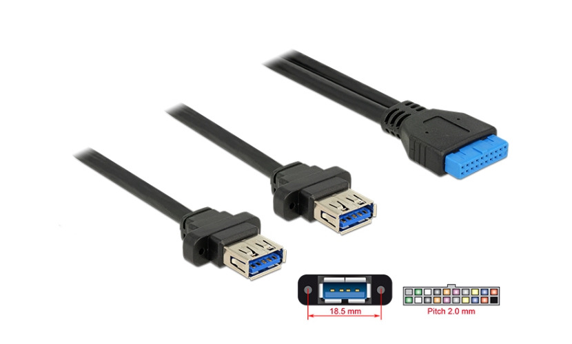 Τεχνικά Χαρακτηριστικά:Connector 1: 1 x 20 pin USB 3.0 pin header femaleConnector 2: 2 x USB 3.0 Type-A femaleData transfer rate: up to 5 GbpsPitch distance: 2.00 mmCable diameter: 5.5 mmPin finishing: Gold-platedConductor gauge: 28 AWG data line, 24 AWG power lineLength: 80 cmColour: Black