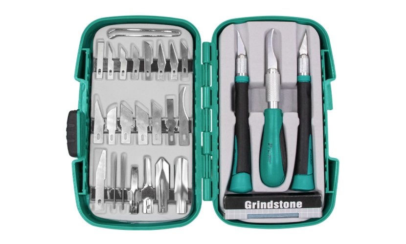 Σετ της PROSKIT το οποίο αποτελείται από 3 κοπίδια ακριβείας, 25 λεπίδες, 1 τσιμπίδα και 1 πέτρα ακονίσματος.Είναι τοποθετημένα μέσα σε πλαστική θήκη, για την εύκολη τακτοποίηση και μεταφορά τους.