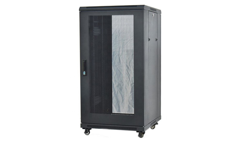 Μεταλλικό rack με 2 διάτρητες πόρτες και αφαιρούμενα πλαϊνά.Οι πόρτες είναι διάτρητες, για μέγιστα αποτελέσματα στον εξαερισμό των συσκευών και εξοπλίζονται με κλειδαριά.Οι πλαϊνές επιφάνειες έχουν σύστημα αφαίρεσης με ένα κουμπί και υποστηρίζουν την τοποθέτηση κλειδαριάς.Το rack έχει θυρίδες εξαερισμού περιμετρικά και στην οροφή και το πάτωμα του διαθέτει αφαιρούμενες θυρίδες που μπορούν να χρησιμοποιηθούν για την εισαγωγή/εξαγωγή καλωδίων ή την τοποθέτηση συστημάτων fan. Οι θυρίδες διαθέτουν βίδες, επομένως είναι επανατοποθετούμενες.Το rack εξοπλίζεται με ρόδες για την εύκολη μετακίνηση του, αλλά διαθέτει και βάσεις, για την σταθεροποίηση του, όταν τεθεί σε λειτουργία.