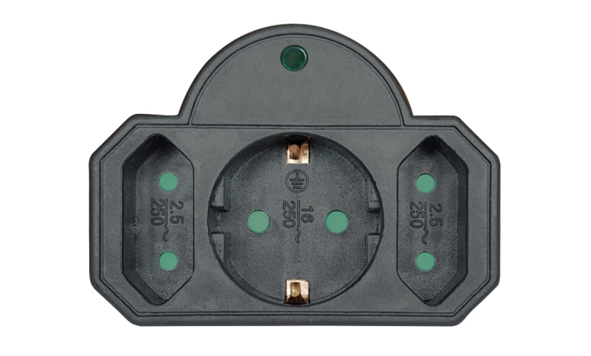 Αντάπτορας ρεύματος Powertech 3 θέσεων, 1x schuko και 2 διπολικών, με μηχανισμό ασφαλείας για παιδιά και προστασία υπέρτασης.