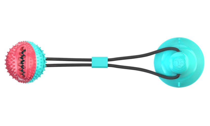 Πολυλειτουργικό παιχνίδι για σκυλιά κατασκευασμένο από ανθεκτικό TPR υλικό με αντοχή στα δαγκώματα, το οποίο επιτρέπει τον αποτελεσματικό καθαρισμό των δοντιών. Αποτελείται από μια μπάλα και μια βεντούζα για τοποθέτηση στο πάτωμα που συνδέονται μεταξύ τους με ένα σχοινί υψηλής αντοχής. Στο εσωτερικό της μπάλας μπορεί να τοποθετηθεί θρυμματισμένη τροφή ή σνακ για σκύλους ενώ διαθέτει και ενσωματωμένο κουδούνι που δημιουργεί έναν απαλό ήχο ο όποιος αποσπά την προσοχή του σκύλου κατά την διάρκεια του παιχνιδιού.
