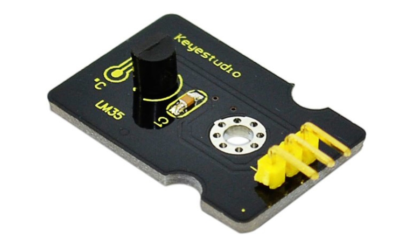 LM35 linear temperature sensor της Keyestudio για Arduino. Μπορεί να χρησιμοποιηθεί για την ανίχνευση της θερμοκρασίας του αέρα του περιβάλλοντος. Προσφέρει λειτουργικό εύρος από 0°C έως 100°C. Η ευαισθησία είναι 10mV ανά βαθμό Κελσίου και η τάση εξόδου είναι ανάλογη της θερμοκρασίας.