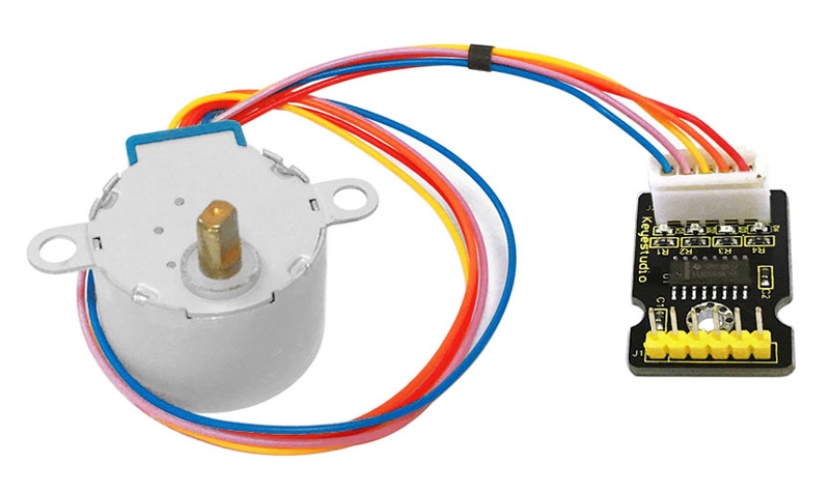 Stepper motor driver module και stepper motor της Keyestudio. Μπορεί να μετατρέψει τους ηλεκτρικούς παλμούς σε διακριτές μηχανικές κινήσεις.