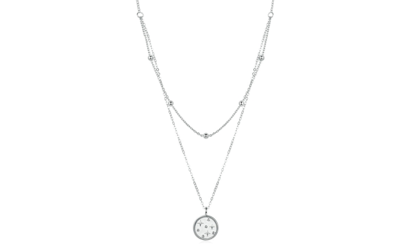 Εντυπωσιακό κολιέ, με ιδιαίτερο και μοναδικό design. Διαθέτει δυο αλυσίδες, η μία διακοσμημένη με μπίλιες και η άλλη με μενταγιόν σε σχήμα κύκλου με μοτίβο αστεριών. Κατασκευάζεται από ασήμι 925 με επιπλατίνωμα.Μπορεί να φορεθεί όλες τις ώρες της ημέρας και με κάθε στυλ ντυσίματος!
