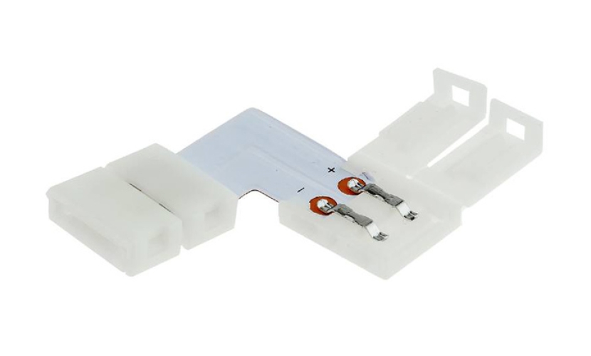 Γωνιακό connector της Optonica για LED καλωδιοταινία 5050, κατασκευασμένο από ανθεκτικό πλαστικό υλικό.Συμβατό με όλες τις καλωδιοταινίες 5050 της Optonica.