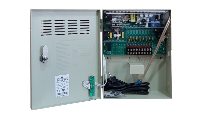 Φορτιστής και τροφοδοτικό 12V 10A σε κουτί. Δέχεται μπαταρία εφεδρείας, κατάλληλο για τροφοδοσία σε κάμερες CCTV, συστήματα ελέγχου πρόσβασης, συναγερμούς κλπ. Διαθέτει μεταλλικό κουτί με εξωτερικό κλείδωμα, 9 ανεξάρτητες εξόδους με κλέμες. Επίσης, διαθέτει PTC προστασία σε κάθε κανάλι ξεχωριστά, για την σύνδεση της κάθε κάμερας και ανεξάρτητη έξοδο φόρτισης της μπαταρίας. Επιπλέον, διαθέτει κεντρικό ρυθμιστικό τάσης εξόδου, ώστε να ρυθμίσετε την τάση εξόδου σύμφωνα με τις ανάγκες της εγκατάστασης σας.