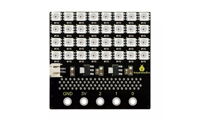 SK6812 4x8 LED dot matrix shield για Micro:bit από την Keyestudio. Διαθέτει 32 φώτα LED SK6812, πλήρως συμβατά με την πλακέτα ελέγχου Micro:bit και 2x 3.3V regulator chips.