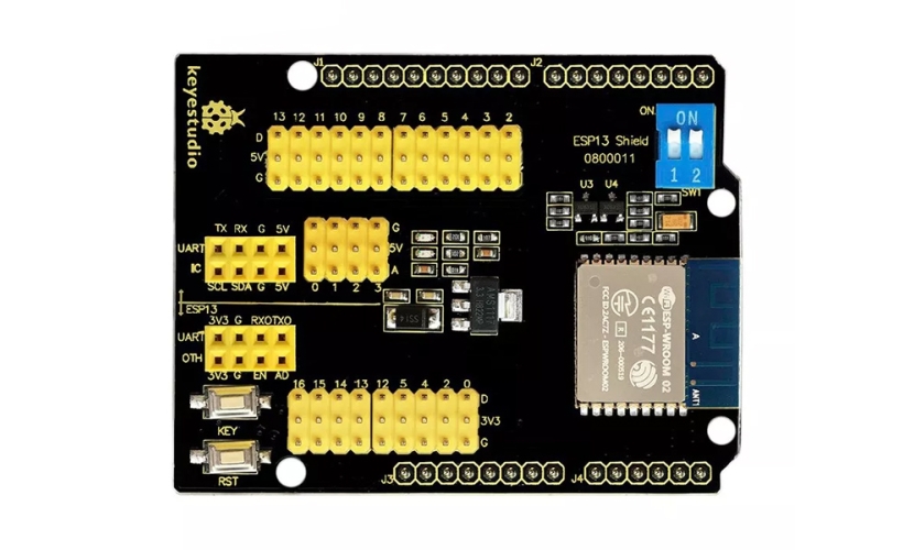 Το ESP13 shield serial port module για Arduino microcontrollers από την Keyestudio, είναι ειδικά σχεδιασμένο για τη σύνδεση του WiFi. Το pin είναι συμβατό με κύριες πλακέτες ελέγχου όπως το Arduino Uno και το Mega2560. Επιπλέον, χρησιμοποιεί το τσιπ μετατροπής τάσης κατά τη σύνδεση του Arduino MCU, το οποίο είναι συμβατό με 3,3V και 5V.