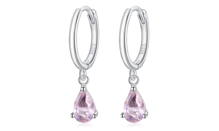 Σκουλαρίκια κρίκος Bamoer κατασκευασμένα από ασήμι 925, επιπλατινωμένα, διακοσμημένα με αστραφτερή κυβική ζιρκόνια σε σχήμα δάκρυ, ημιδιαφανούς ροζ χρώματος η οποία αντανακλά μοναδικά το φως και προσφέρει λάμψη στο κόσμημα.Είναι ένα κόσμημα υψηλής αισθητικής που συνδυάζεται υπέροχα με όλες τις καθημερινές σας εμφανίσεις.