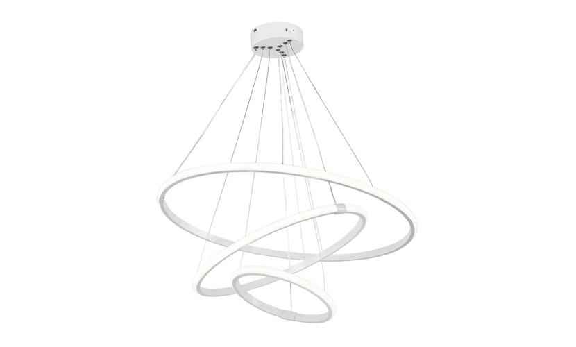 Μοντέρνο LED φωτιστικό οροφής αποτελούμενο από τρεις δακτυλίους με διάμετρο 20cm, 40cm και 60cm και ισχύ 44W.Το εντυπωσιακό σχέδιο του με το μεταλλικό σώμα, σε συνδυασμό με το λευκό χρώμα του προσδίδει συμβατότητα σε κάθε χώρο ενώ η κατασκευή του διακρίνεται για την ποιότητα της και το λεπτεπίλεπτο φινίρισμα της.Τα σύρματα και τα καλώδια του φωτιστικού αυξομειώνονται κατά βούληση, δίνοντας σας την ελευθερία να το σχηματίσετε όπως επιθυμείτε. Τα καλώδια ρυθμίζονται με ένα βιδάκι συγκράτησης ενώ τα σύρματα εξοπλίζονται με ένα έξυπνο σύστημα όπου πιέζοντας τον εσωτερικό δακτύλιο του άκρου του αποδεσμεύεται το σύρμα.Τα 3 φωτιστικά σώματα με χρώμα φωτός 4000K θα φωτίσουν ξεκούραστα τον χώρο, ενώ διακρίνεται για την οικονομική του λειτουργία, χάρη στην εξοικονόμηση ενέργειας που προσφέρει η τεχνολογία LED.Η ποιοτική του κατασκευή εγγυάται την εκτεταμένη διάρκεια ζωής του φωτιστικού.