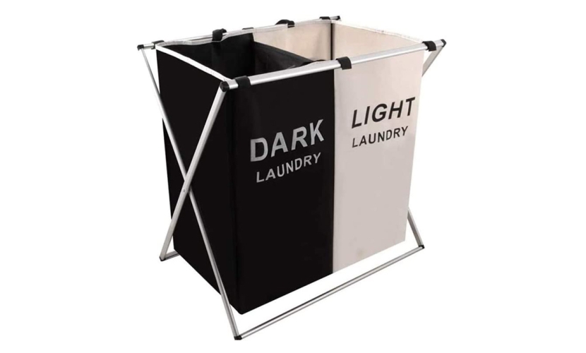 Καλάθι απλύτων με 2 σάκους και σχεδιασμό που χρησιμεύει ως ταξινομητής για λευκά ή σκούρα ρούχα και καθιστά τη διαδικασία του πλυσίματος πολύ ευκολότερη.Είναι κατασκευασμένο από ανθεκτικό ύφασμα, στιβαρό και ελαφρύ πλαίσιο που το καθιστά εύκολο στην μεταφορά.