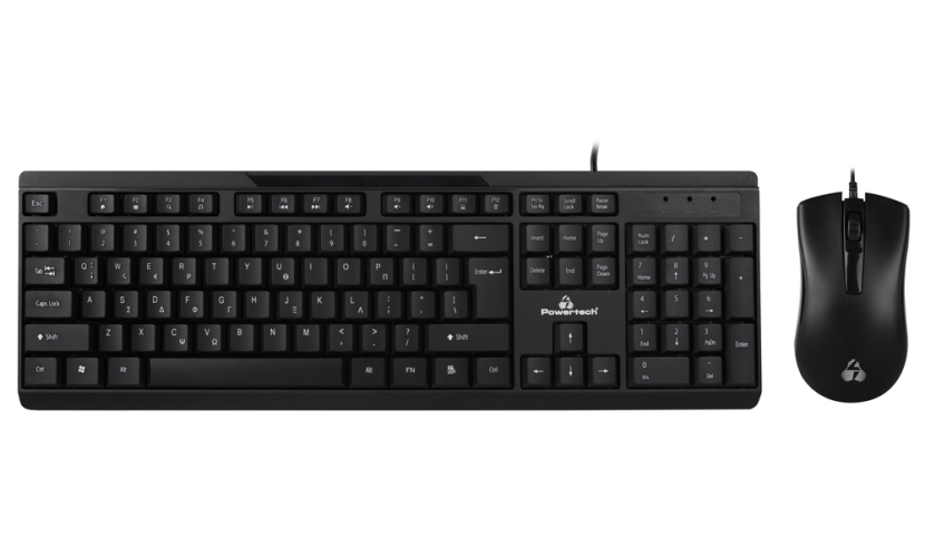 Set περιφερειακών για PC από την Powertech που αποτελείται από ενσύρματο πληκτρολόγιο και ενσύρματο οπτικό ποντίκι.