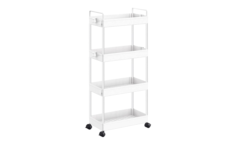 Τρόλει κουζίνας με 4 ράφια για την αποθήκευση και οργάνωση τροφίμων και αντικειμένων.Διαθέτει 4 ρόδες που επιτρέπουν την εύκολη μετακίνηση του, με μηχανισμό κλειδώματος που εξασφαλίζει τη σταθερότητα όταν απαιτείται.Επιπλέον, εξοπλίζεται με γάντζους που παρέχουν περισσότερο χώρο αποθήκευσης για τα αντικείμενα σας.Είναι ιδανικό για την κουζίνα και το μπάνιο σας.