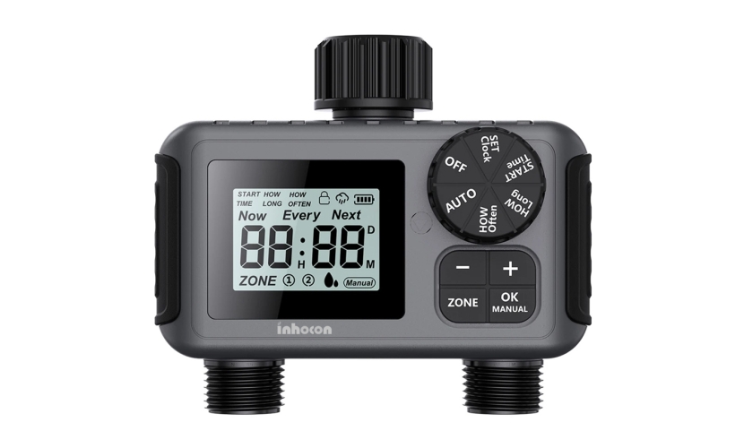 Ψηφιακός προγραμματιστής ποτίσματος της Inhocon, ιδανικός για εργασίες που σχετίζονται με το πότισμα και την άρδευση των φυτών στον κήπο. Σας επιτρέπει με εύκολο τρόπο να ορίζετε τον χρόνο του ποτίσματος και την διάρκεια του σε ήμερες. Επιπλέον, διαθέτει λειτουργία αναβολής του ποτίσματος λόγο βροχής.Η τροφοδοσία του γίνεται με 4x AA μπαταρίες (δεν συμπεριλαμβάνονται).