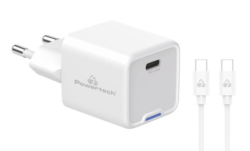 POWERTECH φορτιστής τοίχου PT-1225 με καλώδιο, USB-C, 33W, GaN, λευκός