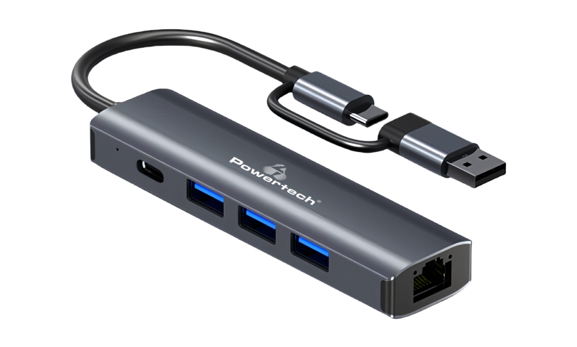 POWERTECH USB hub PTR-0150 με θύρα δικτύου, 4 θυρών, USB & USB-C, γκρι