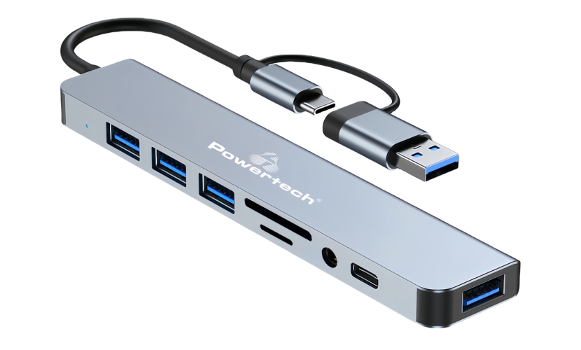 POWERTECH USB hub PTR-0151 με card reader, 8 θυρών, USB & USB-C, γκρι