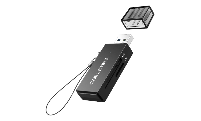 Card reader της Cabletime, σε μέγεθος USB flash, με 2 υποδοχές στις οποίες μπορείτε να τοποθετήσετε μια SD και μια micro SD κάρτα μνήμης.Συνδέεται στον επιτραπέζιο ή φορητό υπολογιστή σας μέσω θύρας USB.