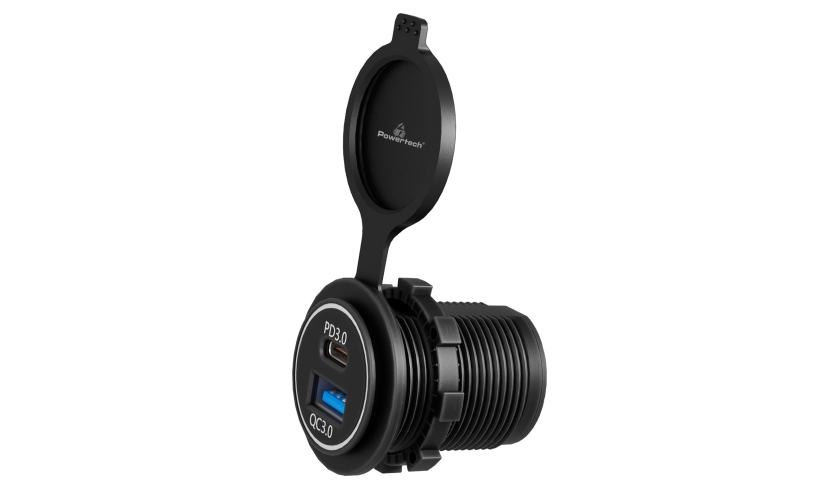 Πρίζα USB της Powertech, κατάλληλη για τοποθέτηση σε σκάφη και οχήματα όπως τρακτέρ κ.α. Εξοπλίζεται με θύρες φόρτισης USB και USB-C για την φόρτιση συσκευών που φορτίζουν μέσω θύρας USB.Διαθέτει προστατευτικό κάλυμμα, το οποίο προστατεύει τις θύρες από σκόνη και υγρασία όταν δεν χρησιμοποιούνται.