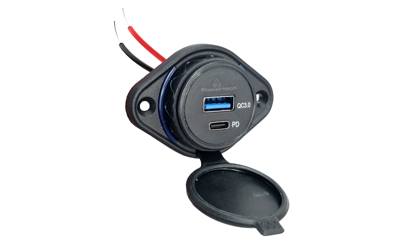 Πρίζα USB της Powertech, κατάλληλη για τοποθέτηση σε σκάφη και οχήματα όπως τρακτέρ κ.α. Εξοπλίζεται με θύρες φόρτισης USB και USB-C για την φόρτιση συσκευών που φορτίζουν μέσω θύρας USB.Διαθέτει προστατευτικό κάλυμμα, το οποίο προστατεύει τις θύρες από σκόνη και υγρασία όταν δεν χρησιμοποιούνται.