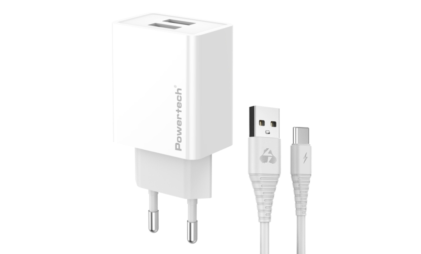 POWERTECH φορτιστής τοίχου PT-1324 με καλώδιο USB-C, 2x USB, 12W, λευκός
