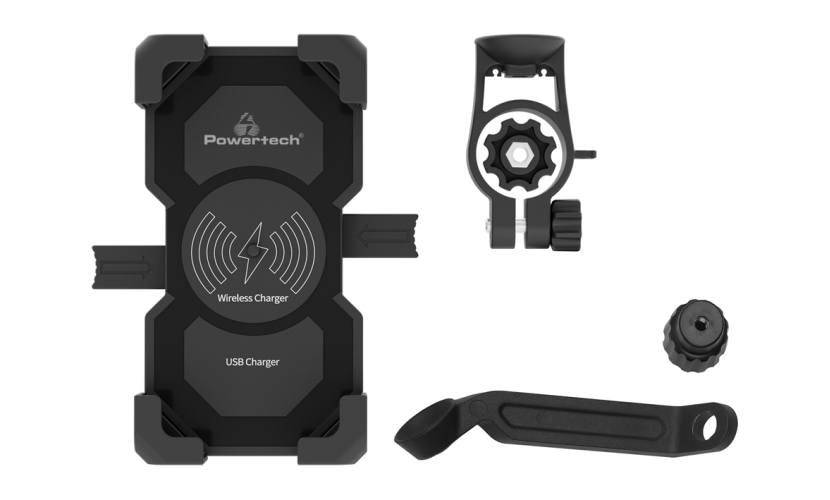 Ασύρματος φορτιστής και βάση smartphone της Powertech με στήριξη στο τιμόνι της μοτοσυκλέτας.Συγκρατεί το smartphone σταθερό και ασφαλές με κλιπ συγκράτησης ενώ παράλληλα το φορτίζει ασύρματα με απόδοση έως 7.5W.Για την λειτουργία του απαιτείται τροφοδοσία από την μπαταρία της μοτοσυκλέτας.