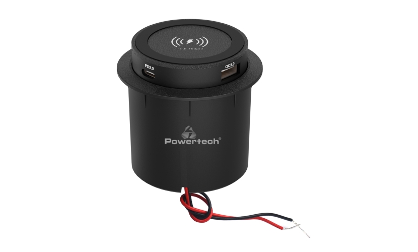 Ασύρματος φορτιστής της Powertech ιδανικός για την φόρτιση συσκευών που υποστηρίζουν ασύρματη φόρτιση, όπως smartphone, smartwatch και ακουστικά.Υποστηρίζει ασύρματη φόρτιση με απόδοση έως 15W. Επιπλέον, εξοπλίζεται με USB και USB-C θύρες που υποστηρίζουν φόρτιση με απόδοση έως 30W και εμφανίζονται με pop up μηχανισμό, πιέζοντας την επιφάνεια του φορτιστή προς τα κάτω.Η τοποθέτηση του γίνεται σε γραφείο, πάγκο ή ακόμη και σε επιφάνεια σκαφών και οχημάτων όπως τροχόσπιτα κ.α. που διαθέτουν οπή με διάμετρο 60mm.Για την τροφοδοσία του απαιτείται σύνδεση με παροχή ρεύματος.