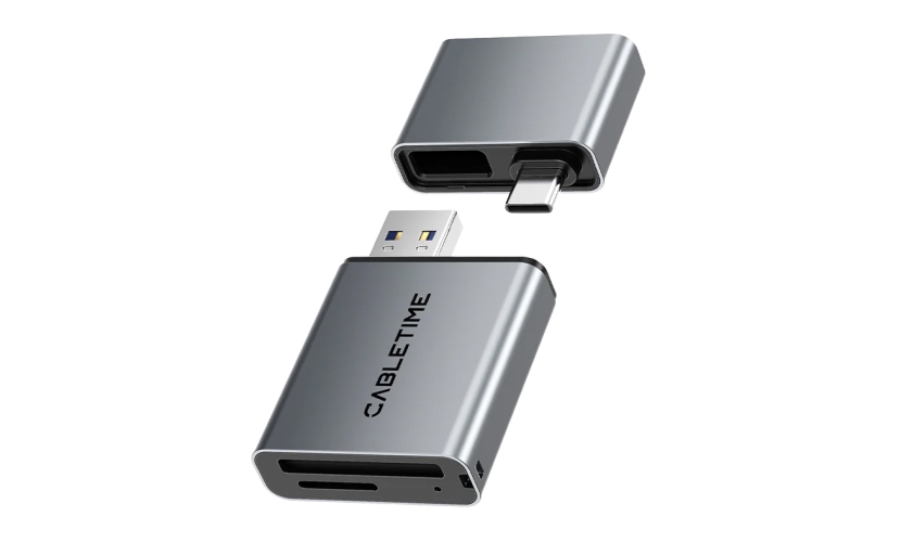 Card reader της Cabletime, σε μικρο μέγεθος, με 2 υποδοχές στις οποίες μπορείτε να τοποθετήσετε μια SD και μια micro SD κάρτα μνήμης.Συνδέεται απευθείας στον υπολογιστή σας μέσω θύρας USB ή USB-C μέσω αποσπώμενου αντάπτορα USB σε USB-C. Ο αποσπώμενος αντάπτορας μπορεί να χρησιμοποιηθεί και μεμονωμένα για τη σύνδεση άλλων συσκευών όπως USB flash drives, εξωτερικούς σκληρούς δίσκους κλπ.