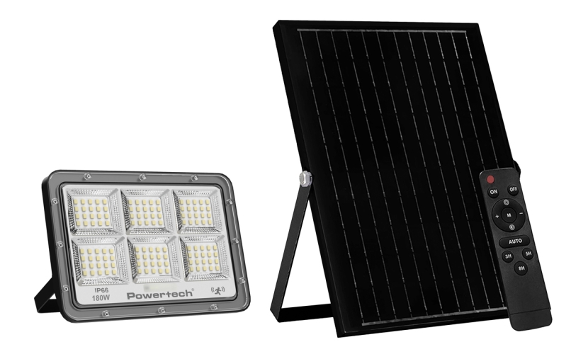 LED ηλιακός προβολέας εξωτερικού χώρου της Powertech με ισχύ 180W. Ενσωματώνει αισθητήρα κίνησης που επιτρέπει την άμεση ενεργοποίηση του προβολέα όταν ανιχνεύεται κίνηση.Διαθέτει μεταλλικό περίβλημα με στεγανοποίηση επιπέδου IP66.Τροφοδοτείται από επαναφορτιζόμενη μπαταρία η οποία φορτίζει μέσω του ενσωματωμένου ηλιακού πάνελ.Στη συσκευασία συμπεριλαμβάνεται τηλεχειριστήριο για τον απομακρυσμένο έλεγχο του προβολέα.