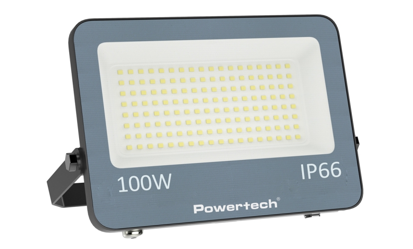 LED προβολέας εξωτερικού χώρου της Powertech με ισχύ 100W. Διαθέτει μεταλλικό περίβλημα με στεγανοποίηση επιπέδου IP66.
