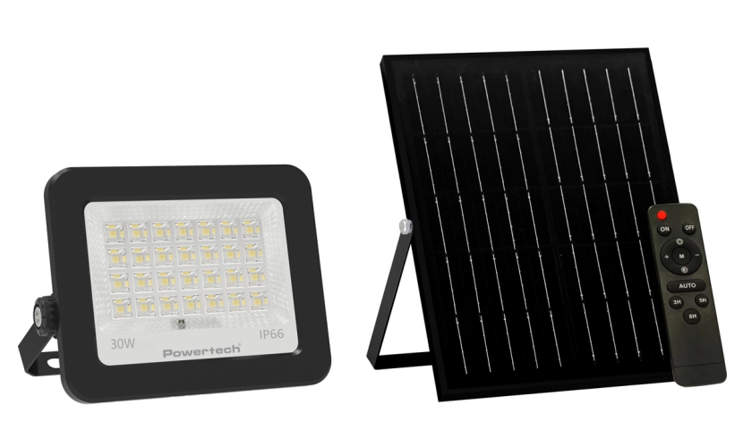 LED ηλιακός προβολέας εξωτερικού χώρου της Powertech με ισχύ 30W. Διαθέτει πλαστικό περίβλημα με στεγανοποίηση επιπέδου IP66.Τροφοδοτείται από επαναφορτιζόμενη μπαταρία η οποία φορτίζει μέσω του ενσωματωμένου ηλιακού πάνελ.Στη συσκευασία συμπεριλαμβάνεται τηλεχειριστήριο για τον απομακρυσμένο έλεγχο του προβολέα.