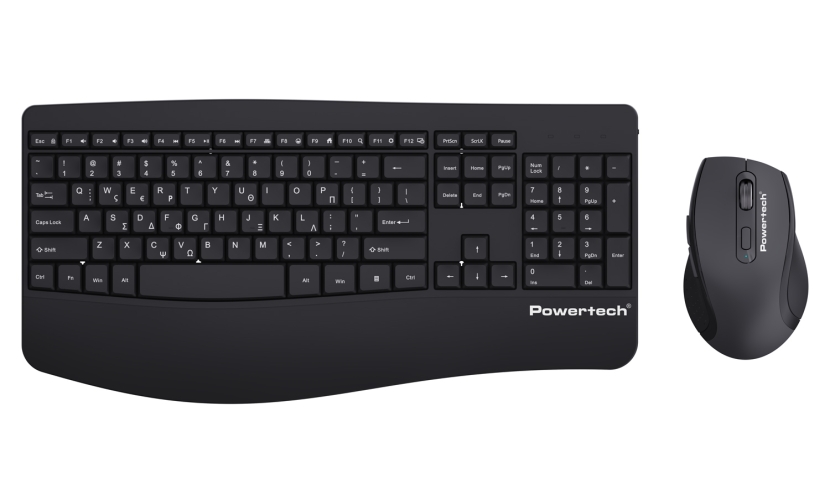 Set περιφερειακών της Powertech που αποτελείται από ασύρματο πληκτρολόγιο και ασύρματο οπτικό ποντίκι. Είναι συμβατά με συσκευές όπως desktop, laptop, tablet κλπ.