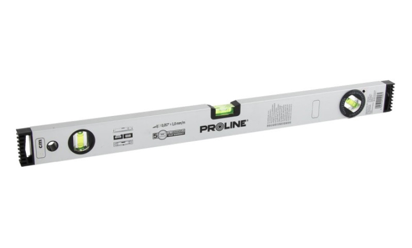 Αλφάδι αλουμινίου Proline με 3 μάτια οριζόντιο, κάθετο και γωνιακό. Διαθέτει μοιρογνωμόνιο στο σώμα του για την ρύθμιση της γωνίας από 1° έως 90°.