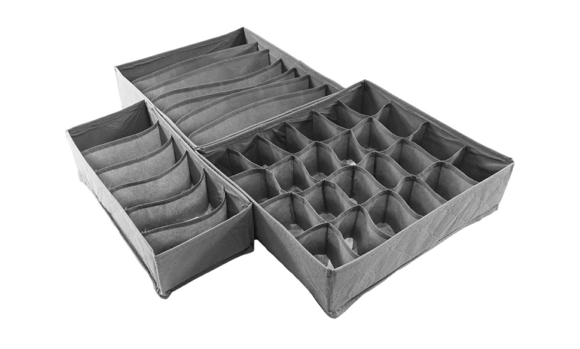 Πρακτικές και βολικές υφασμάτινες θήκες για την οργάνωση εσώρουχων. Το σετ αποτελείται από 3 θήκες με διαφορετικά μεγέθη και αριθμό εσωτερικών θηκών. Διαθέτουν έξυπνο σχεδιασμό με φερμουάρ στο πίσω μέρος που σας επιτρέπει να τις διπλώνετε ώστε να μην πιάνουν πολύ χώρο όταν δεν τις χρησιμοποιείτε.
