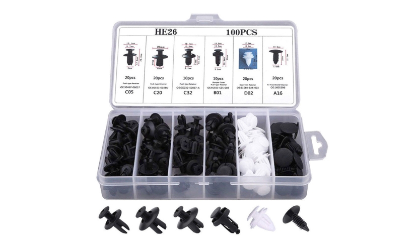 Εξαιρετικό σετ που αποτελείται από 100 κλιπ ιδανικά για ταπετσαρίες, λασπωτήρες, προφυλακτήρες και πόρτες αυτοκινήτων. Το σετ περιλαμβάνει 6 τύπους κλιπ που χρησιμοποιούνται στα περισσότερα οχήματα.Όλα τα κλιπ του σετ είναι τοποθετημένα μέσα σε διάφανη πλαστική θήκη για την εύκολη τακτοποίηση και μεταφορά τους.